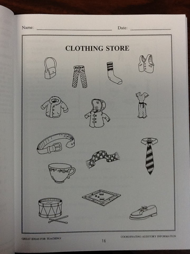 Each of the 25 lessons contain 3-page story sections. Every story has a large picture page that students can do their work on. The picture below is an example of the "clothing store" lesson.